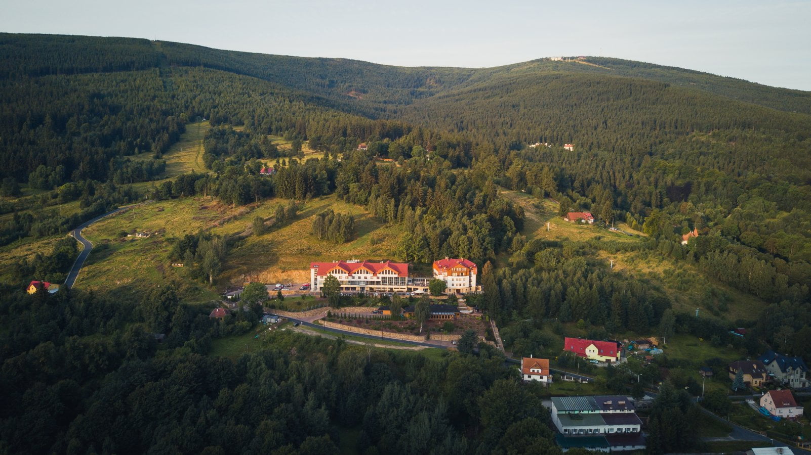 Hotel położony jest na malowniczym wzgórzu, z którego rozciąga się widok na pasmo Gór Izerskich. Do centrum Świeradowa chodziliśmy spokojnym spacerkiem ok. 5 minut.