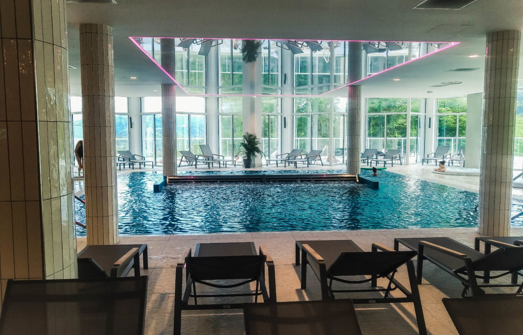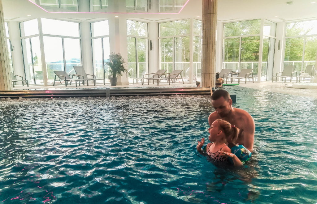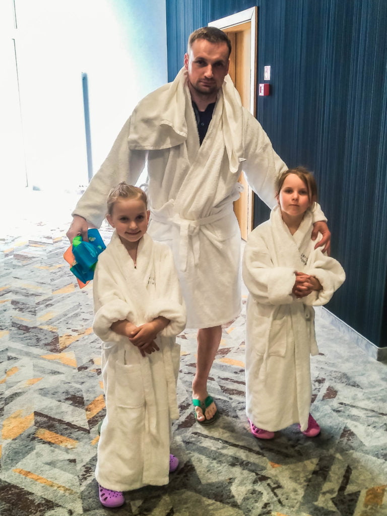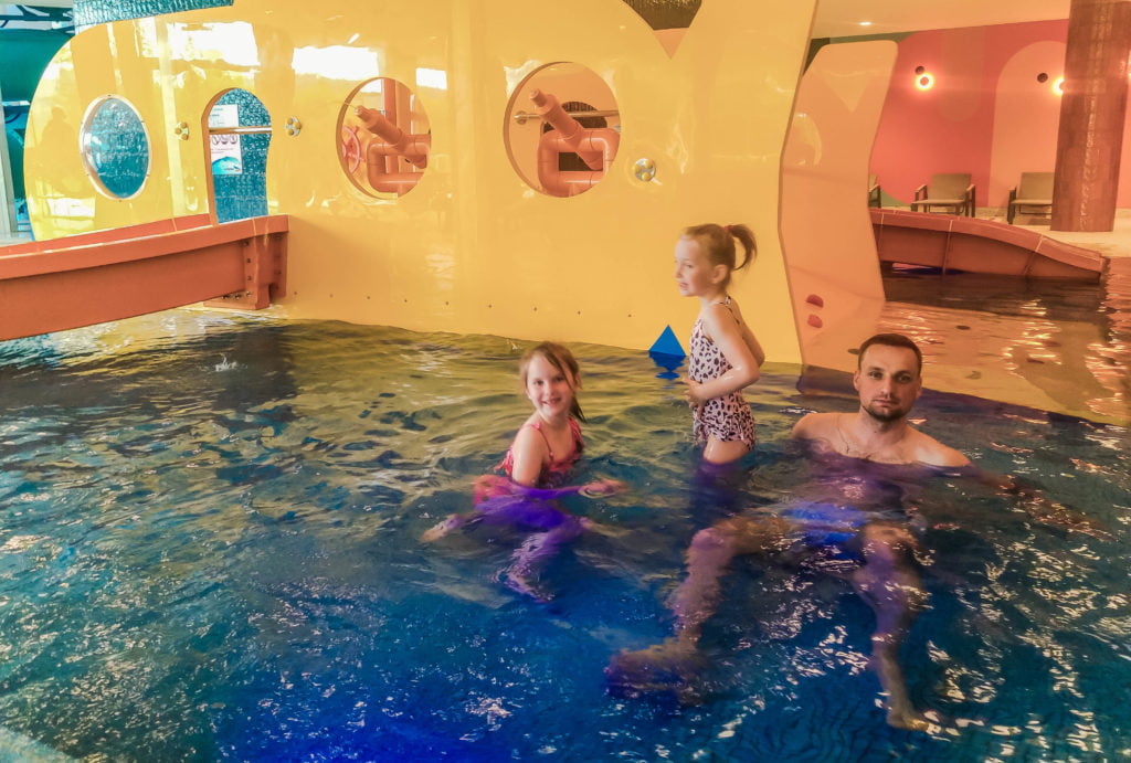 Oczywiście do dyspozycji gości hotelowych jest o wiele więcej: m.in. wypożyczalnia rowerów ( z której mieliśmy skorzystać, ale deszcz pokrzyżował plany) i oczywiście park wodny z basenem zewnętrznym, saunami, zjeżdżalnią, brodzikiem w kształcie łodzi podwodnej, basenem rekreacyjnym czy black pool’em ze strefą ciszy – wyłącznie dla dorosłych. Moje córki kochające wodę spędziły – bez przedady – połowę pobytu właśnie w wodnej strefie obiektu. Podczas pobytów w ramach pakietów i ofert specjalnych atrakcji w Hotelu***** Crystal Mountain jest znacznie więcej.