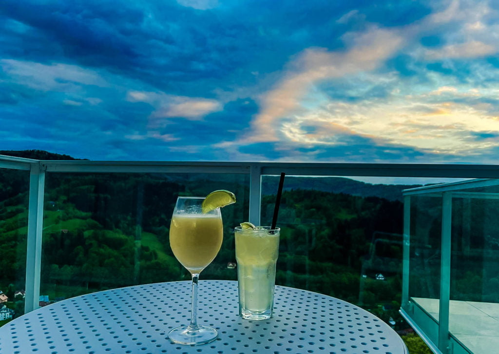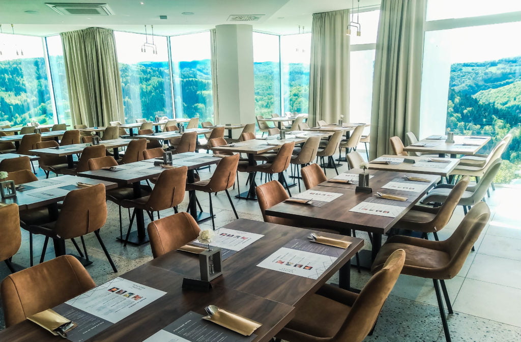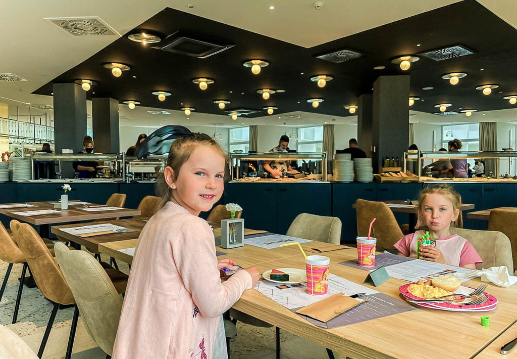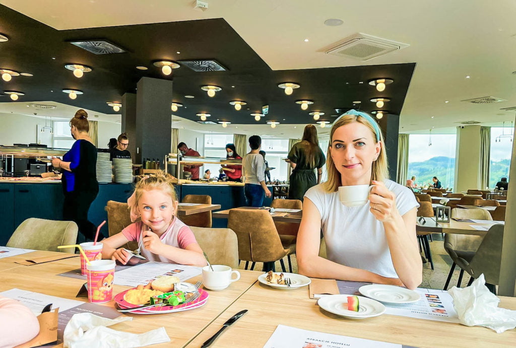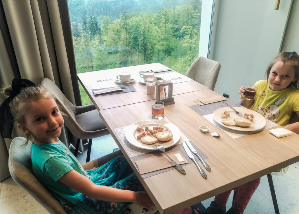 W Hotelu znajdują się dwie restauracje. Każda z wyjątkowym widokiem. Rozpoczynanie dnia od śniadania zjadanego w tak urokliwych okolicznościach przyrody napełnia optymizmem na jego dalszą część. Co znajdziemy w menu? Wszystko. Nie, nie przesadzam. Są pasty, jogurty, koktajle, świeże owoce, twarogi, sery, ciepłe naleśniki, gofry, pieczywo, wędliny, ryby, rozmaite pieczywo i wiele innych. Nie inaczej jest z bogatymi i wybornymi obiadokolacjami. Potrawy nie tylko zaspokoją głód po zdobyciu górskich szczytów, ale też zaskoczą – jak np. moja ulubiona tajska zupa, którą ostatni raz w tak dobrym wydaniu jadłam na wyspie Koh Samui jakieś sześć lat temu. Z jednej stronie jest tradycyjnie (pierogi ruskie, z grzybami i kapustą, krem z pomidorów), z drugiej zaś niebanalnie ( gulasz z dzika, mięciutka i świetnie przyprawiona jagnięcina). Z pewnością dodatkowym walorem jest specjalnie menu dziecięce. Wasze pociechy mogą skusić się na pyszne rybne kotleciki, stripsy z kurczaka z frytkami czy klasyczną pizzę margheritę. Oczywiście podczas posiłków macie do dyspozycji soki oraz kawy i herbaty. Są jednak także koktajle z sezonowych owoców, jogurty czy kefiry.
