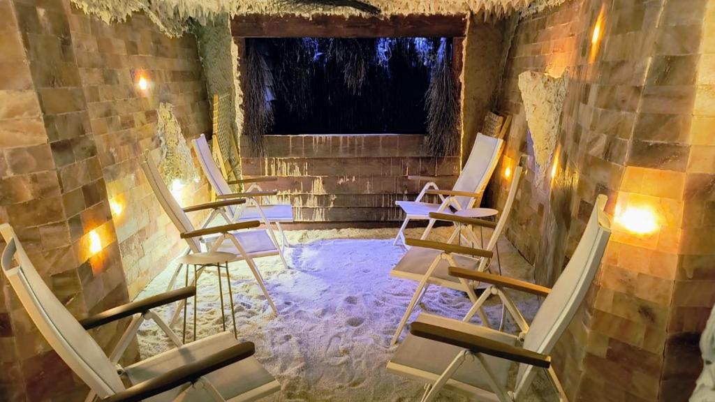 - Kompleks saunowy: sauna fińska, łaźnia parowa, sauna solna, sauna ziołowa, sauna rodzinna oraz grota lodowa,